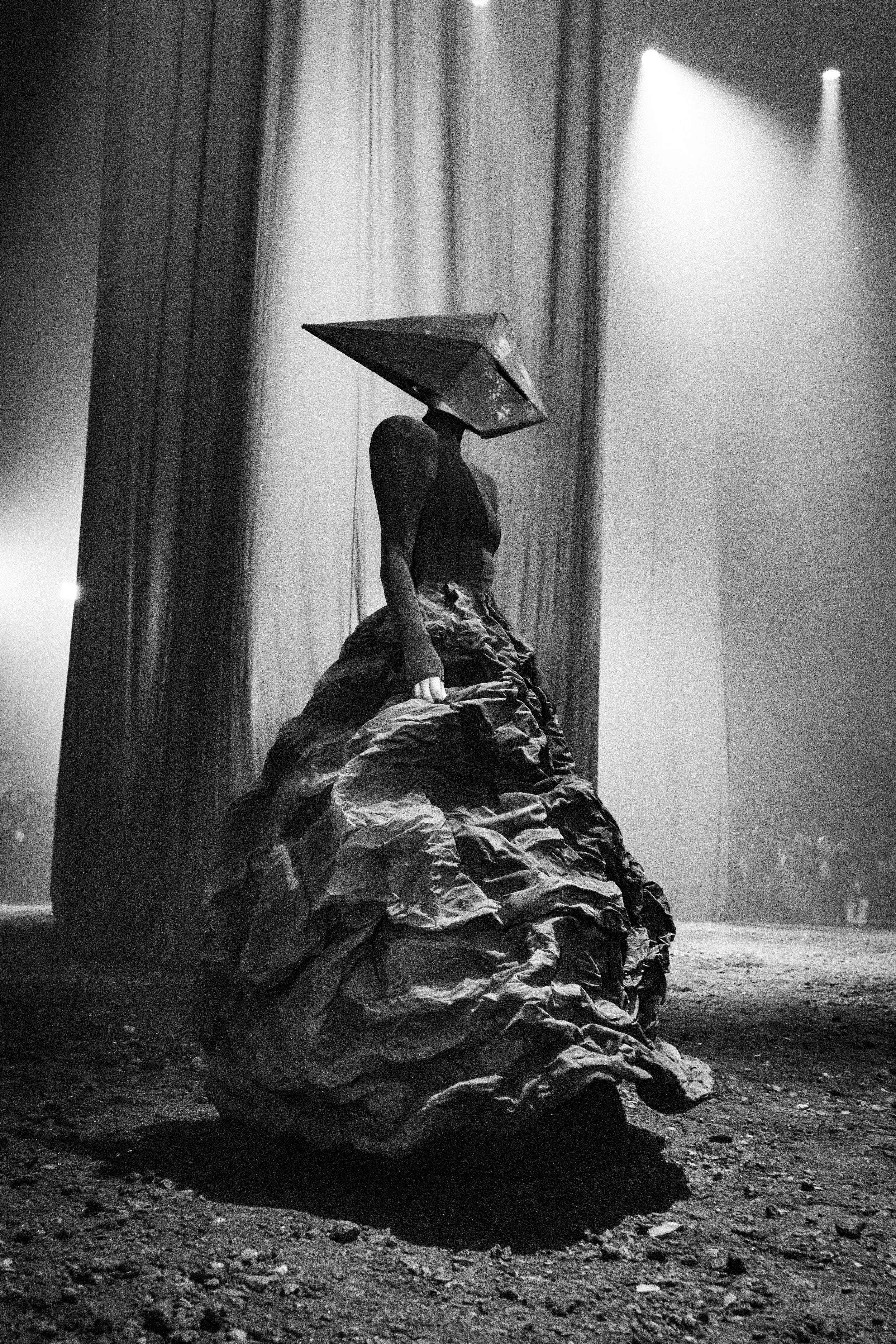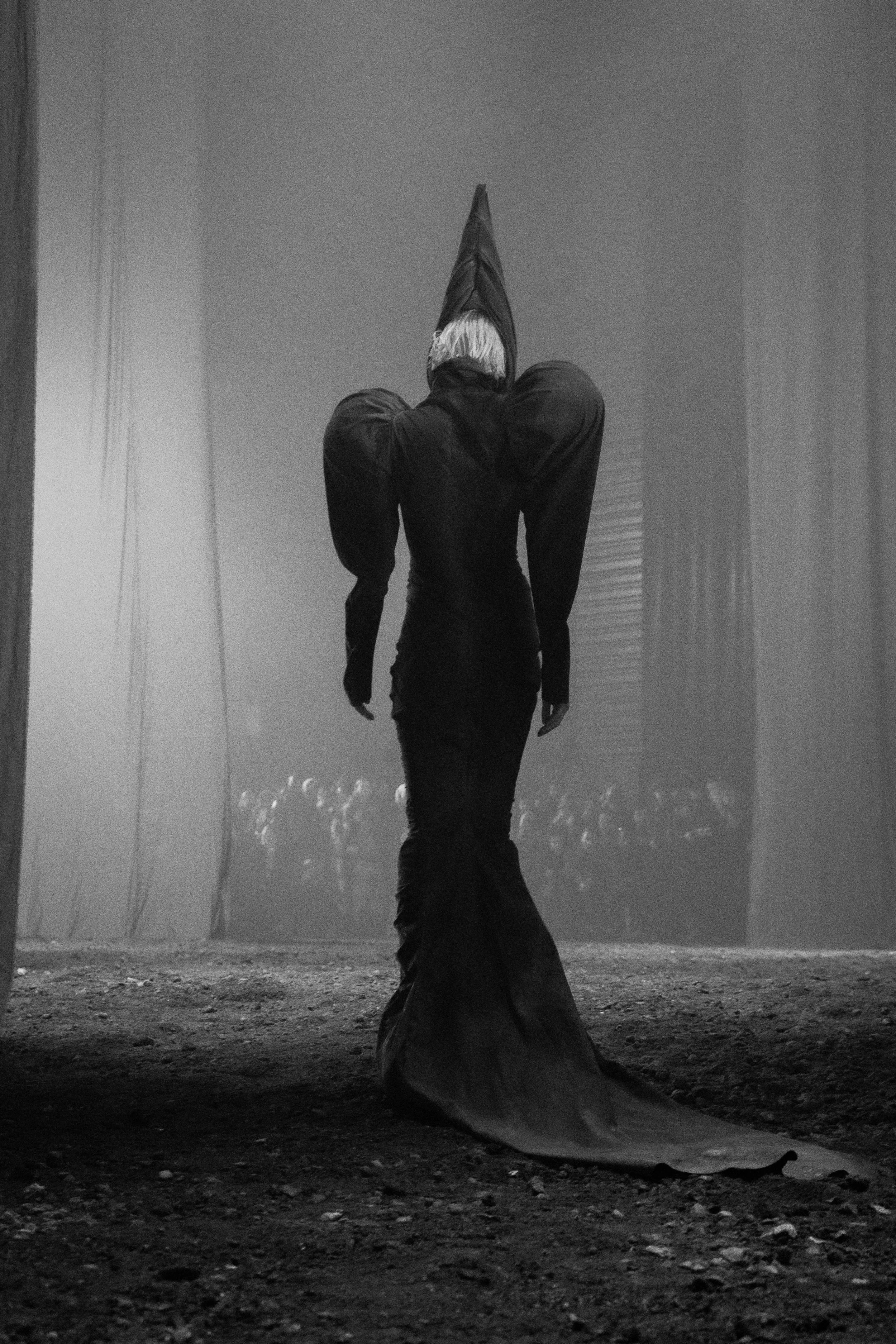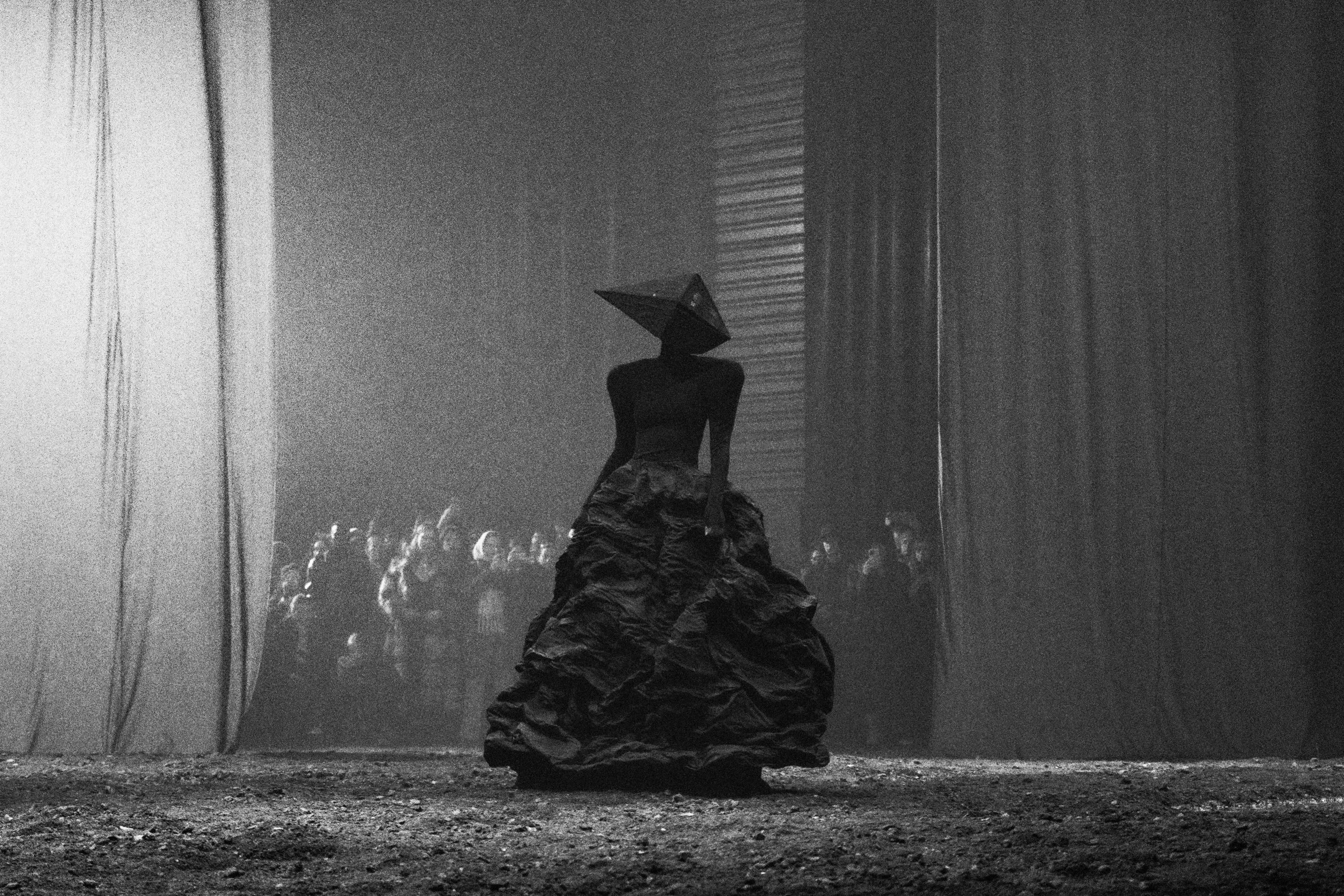 The show featured a slow, ongoing unveiling of various characters which wore dramatic, geometric forms. Silhouetting the space, each model slowly slunk past audience members into the smoke-and-dirt blended air. Arriving as distinct roles throughout the presentation-style runway, movements were intentionally slowed – allowing audience members to engage with each piece as it interacted with the surrounding environment. Elongated dress trains dragged behind each of the models as they became caked with mud. A result of being pulled through puddles and gravel littered floors.