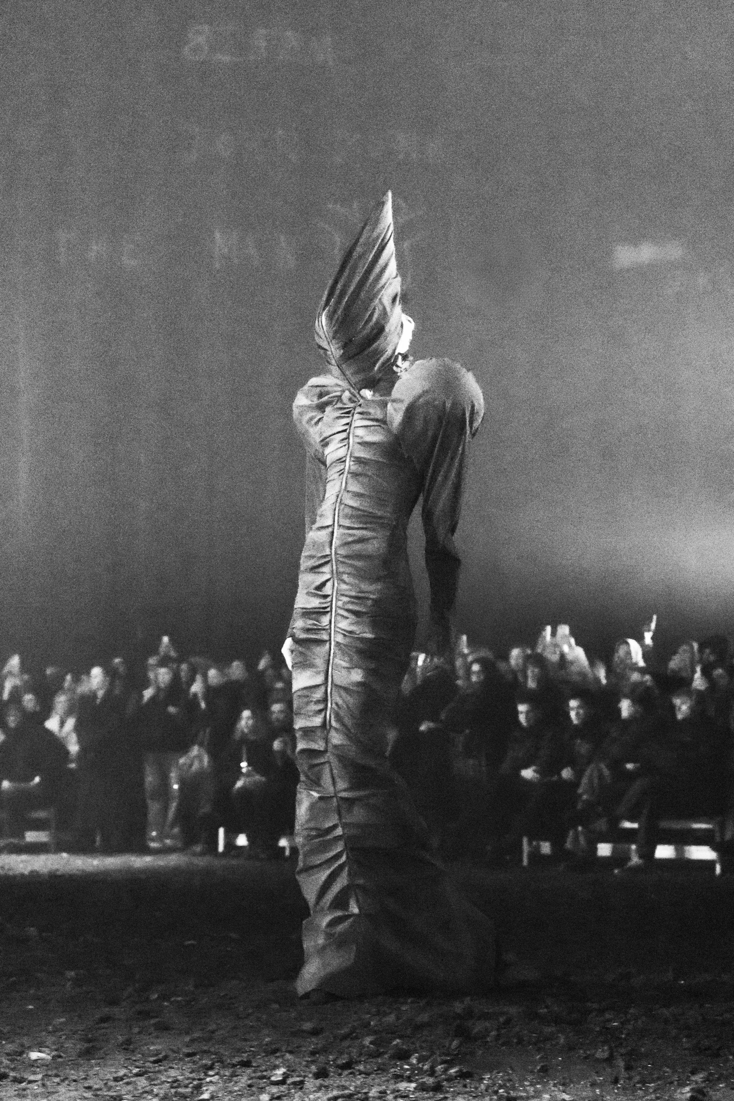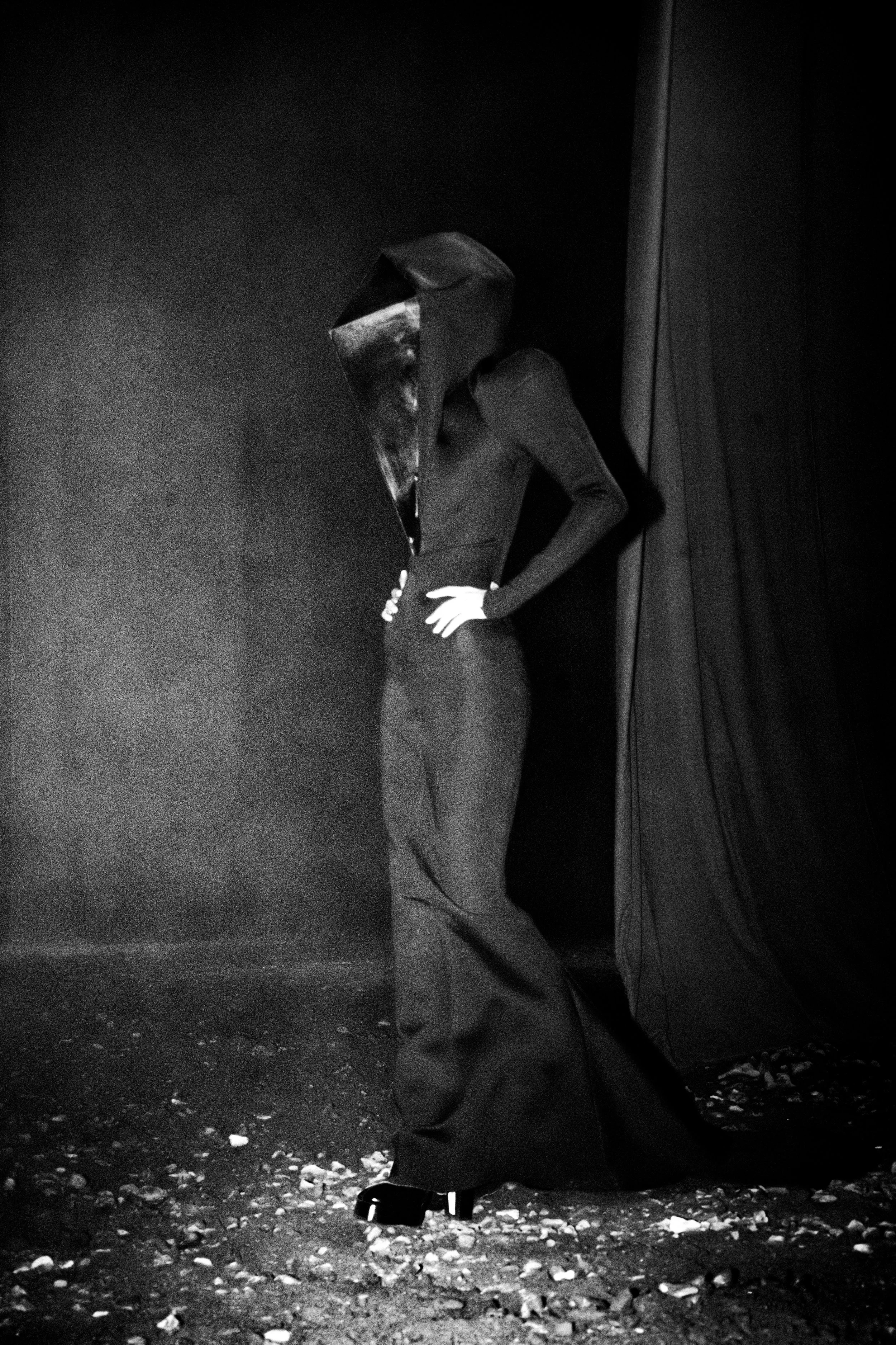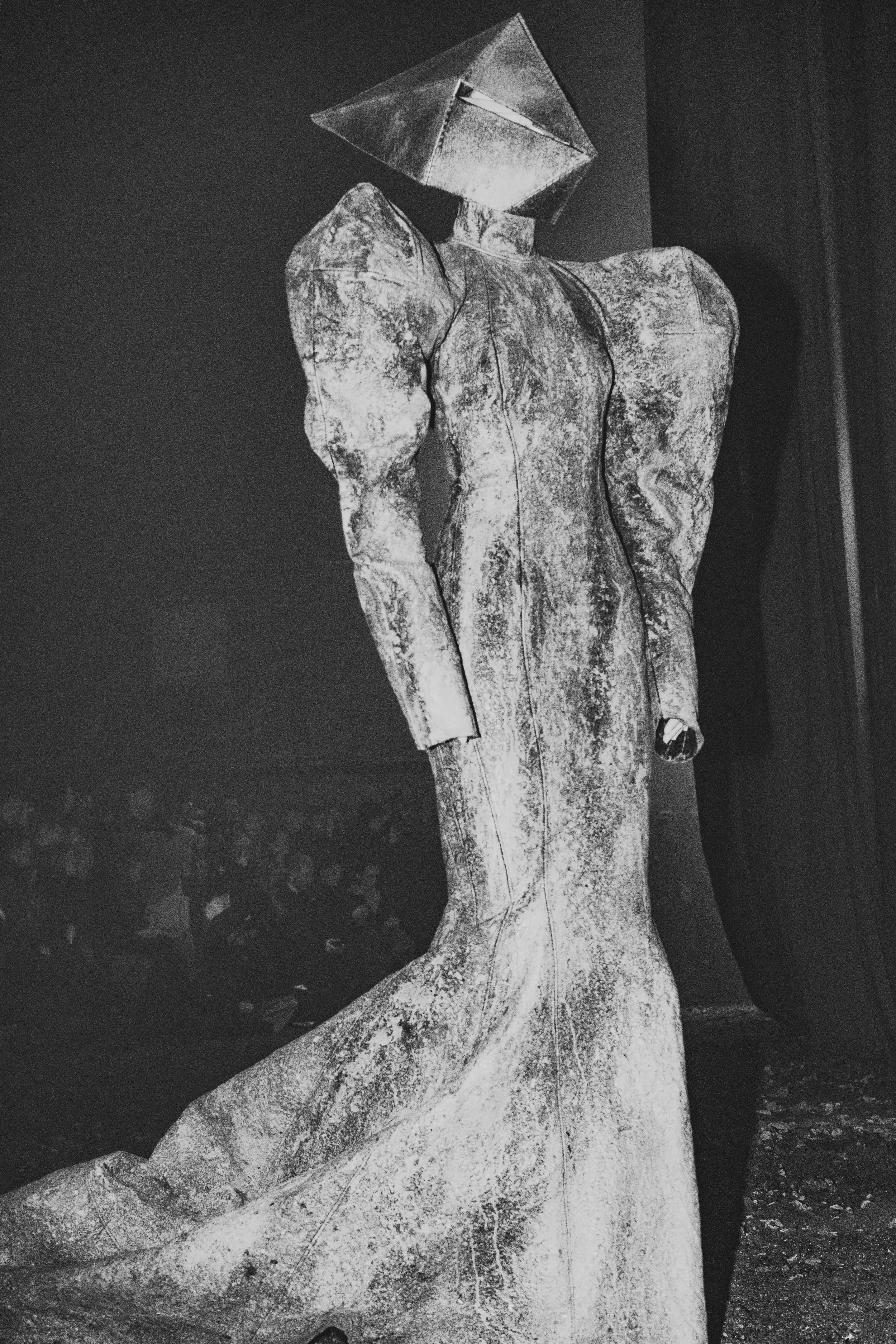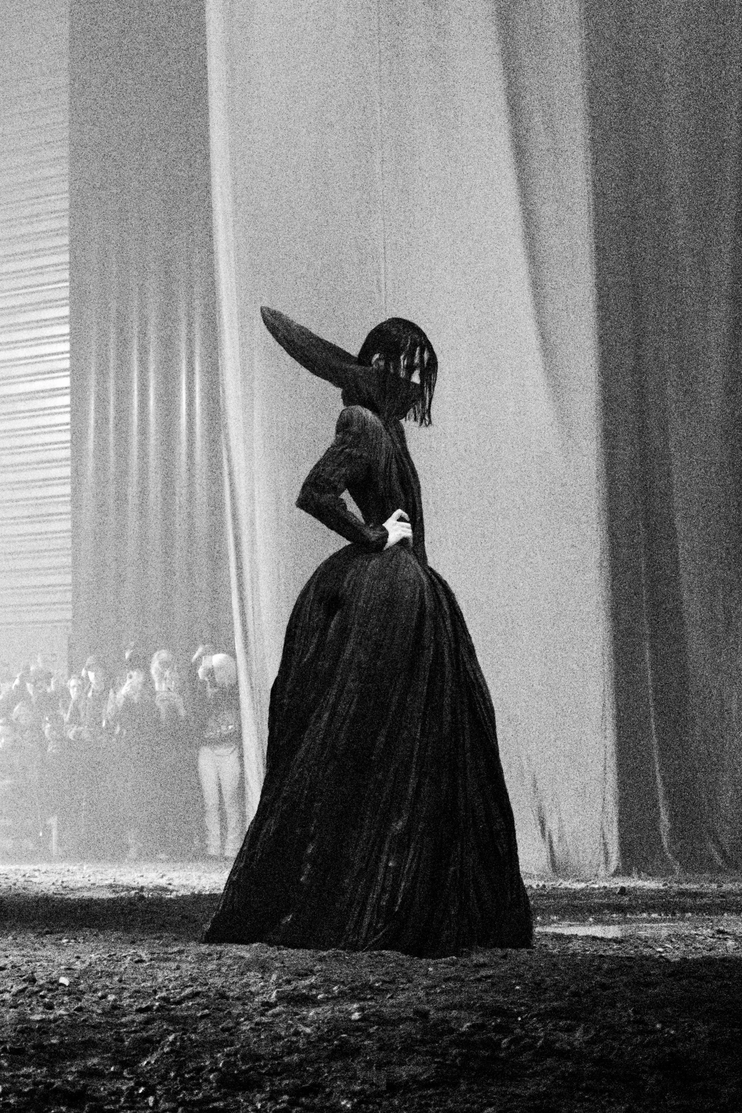 The show featured a slow, ongoing unveiling of various characters which wore dramatic, geometric forms. Silhouetting the space, each model slowly slunk past audience members into the smoke-and-dirt blended air. Arriving as distinct roles throughout the presentation-style runway, movements were intentionally slowed – allowing audience members to engage with each piece as it interacted with the surrounding environment. Elongated dress trains dragged behind each of the models as they became caked with mud. A result of being pulled through puddles and gravel littered floors.