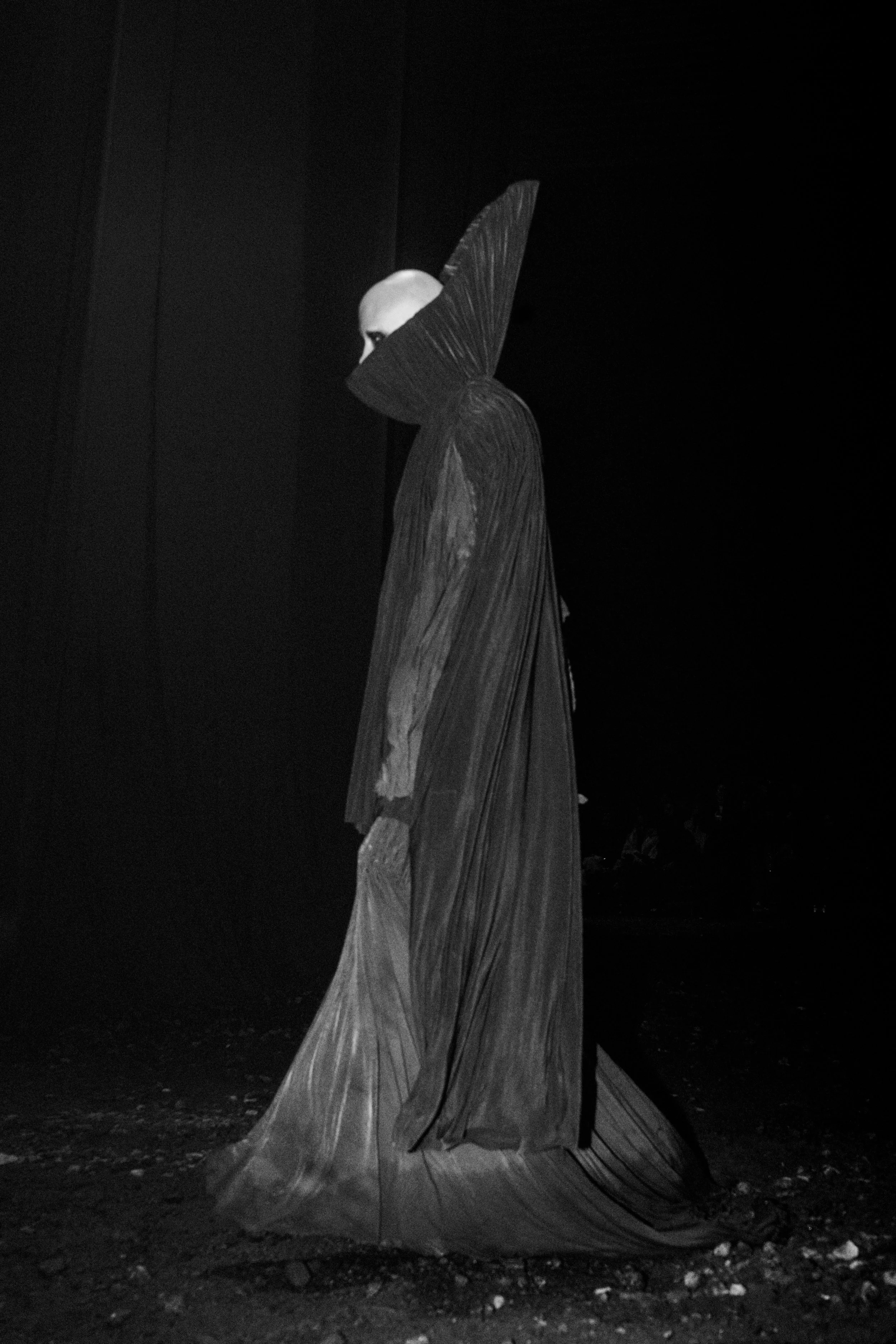 Viewers could peek around their undulating forms to witness otherworldly entities curving as they walked their width. In a chilling act, each model stopped and stared intermittently. It seemed as if we weren’t supposed to witness them, but once the wires had crossed, it was clear there was no turning back.